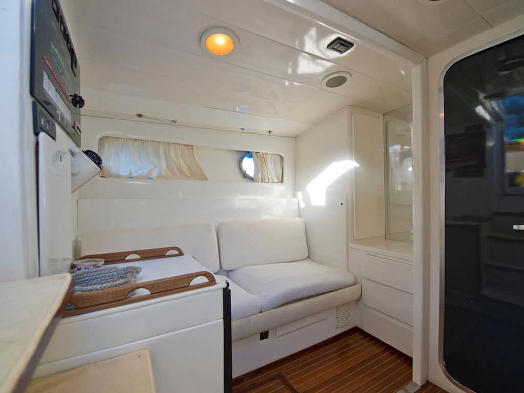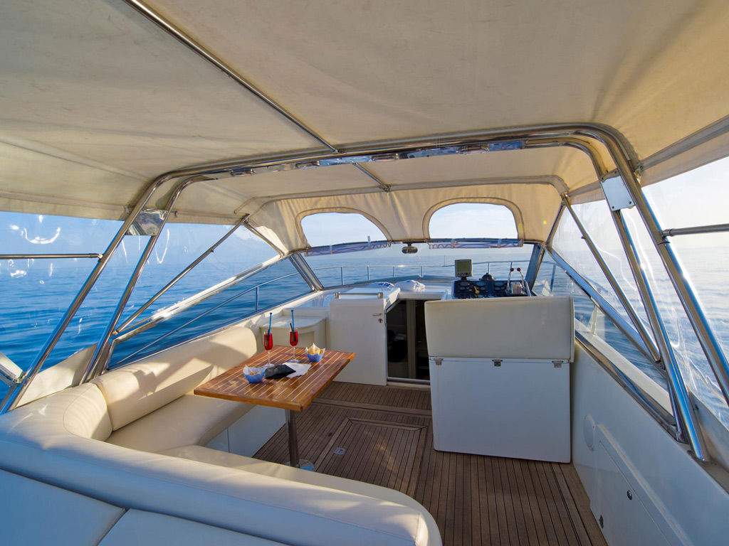 In the front, there is a sun deck to enjoy the sunlight and, in the back, there are other comfortable seats with a dining table and a platform with a ladder for a swim in the clear waters of the coast. The boat is also equipped with a radio, shower, towels and minibar with soft drinks and snacks.