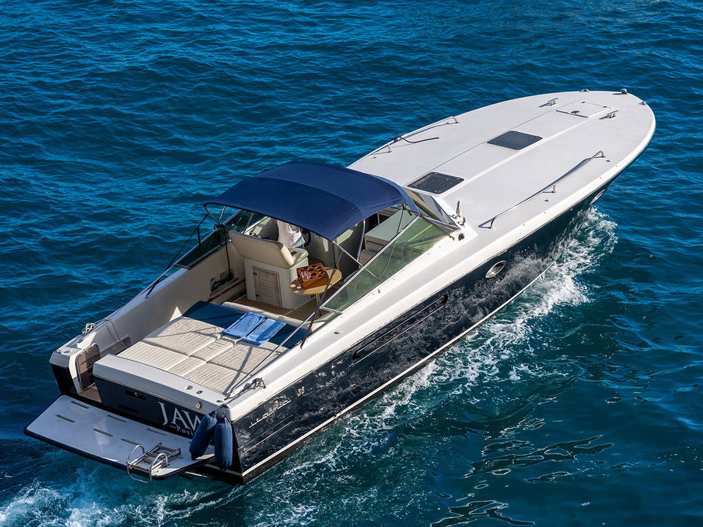The “Jaw S” is provided with a private cabin, comprehensive of a bed and a bathroom. In the front, there is a large sundeck for enjoying the sunshine and on the back, there are cozy couches with a lunch table where resting under the cool awning. At the stern, you will also find a shower and a swim platform.
