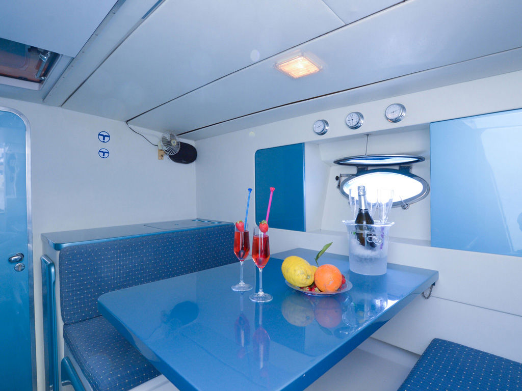 With its 12 meters long, this boat can comfortably host a maximum of 6 people plus the captain.