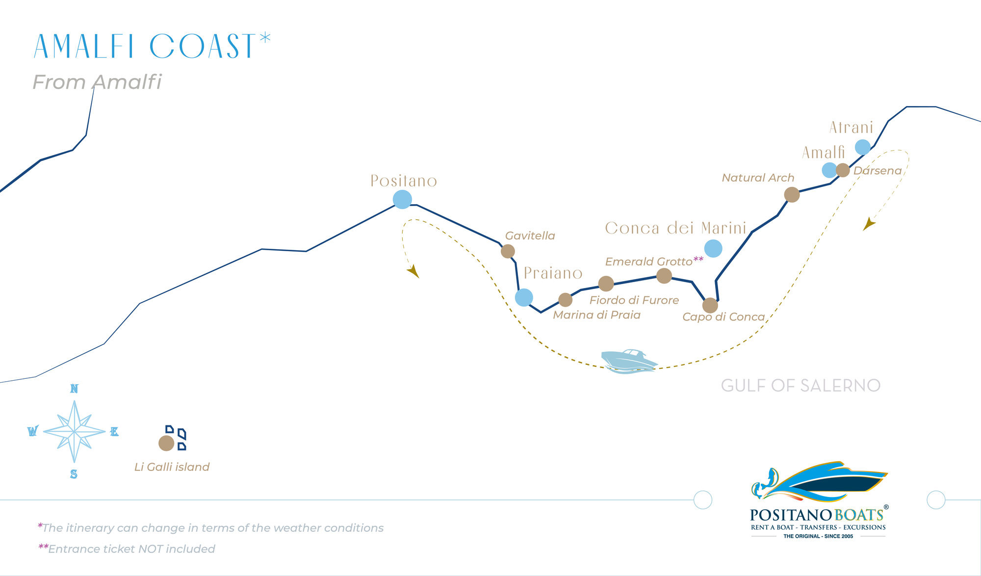 Along the way, you will find the enchanting Grotta dello Smeraldo (entrance ticket not included in the tour price), an optional visit that you can choose whether to undertake or stay on board.