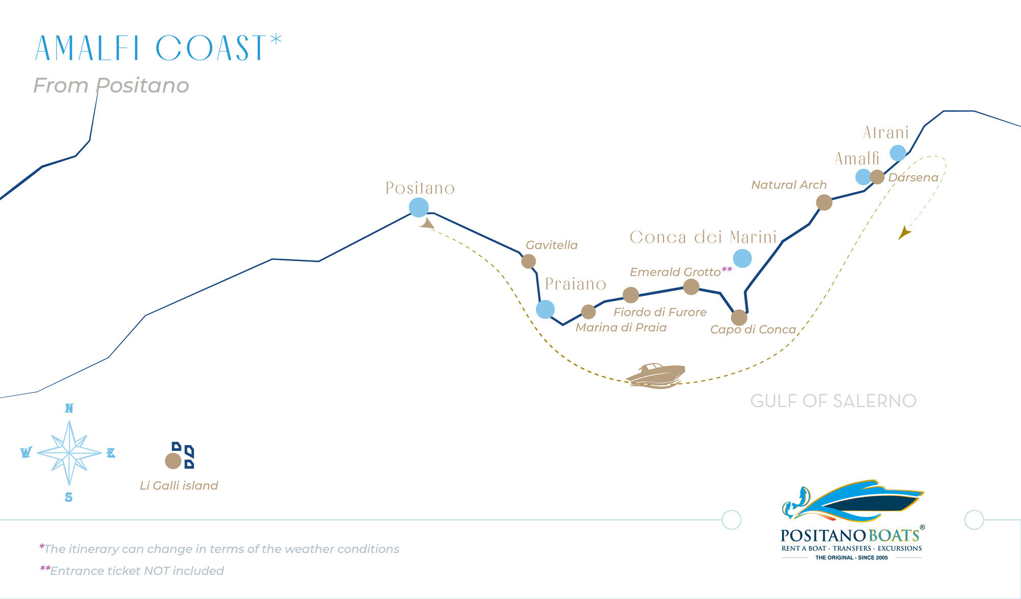 The meeting point is at our blue and white stand called Positano Boats, on the Positano main beach known as “La Spiaggia Grande”