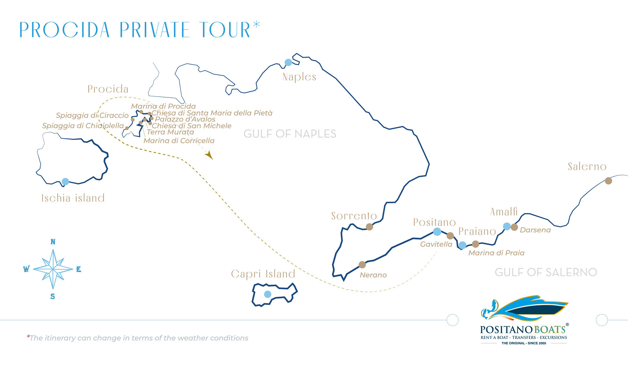 Departure from Positano* at 9:30 AM, towards the island of Procida, with a speed and elegant motorboat.